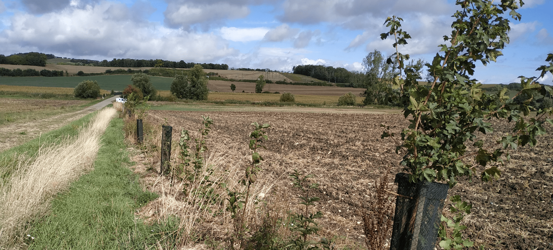 Fidèle à ses convictions écologiques, Claire a fait le choix de ne pas utiliser de protections plastiques pour les jeunes plants. La haie s’inscrit aussi dans une logique de reconnection des trames arborées, en renforçant les continuités écologiques du paysage.